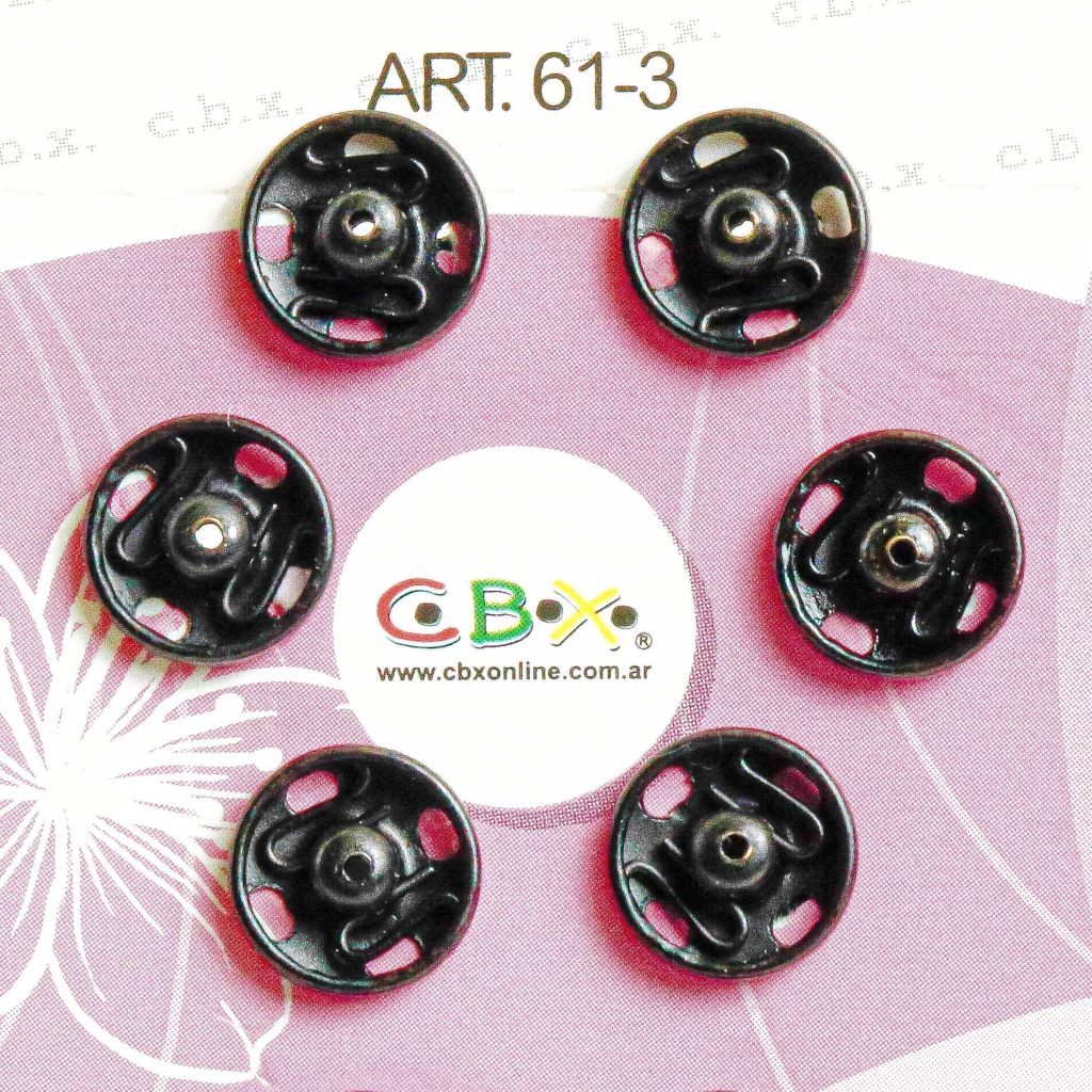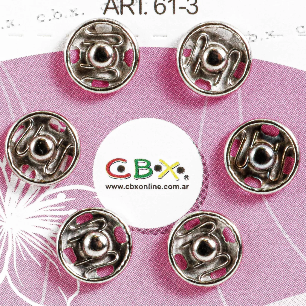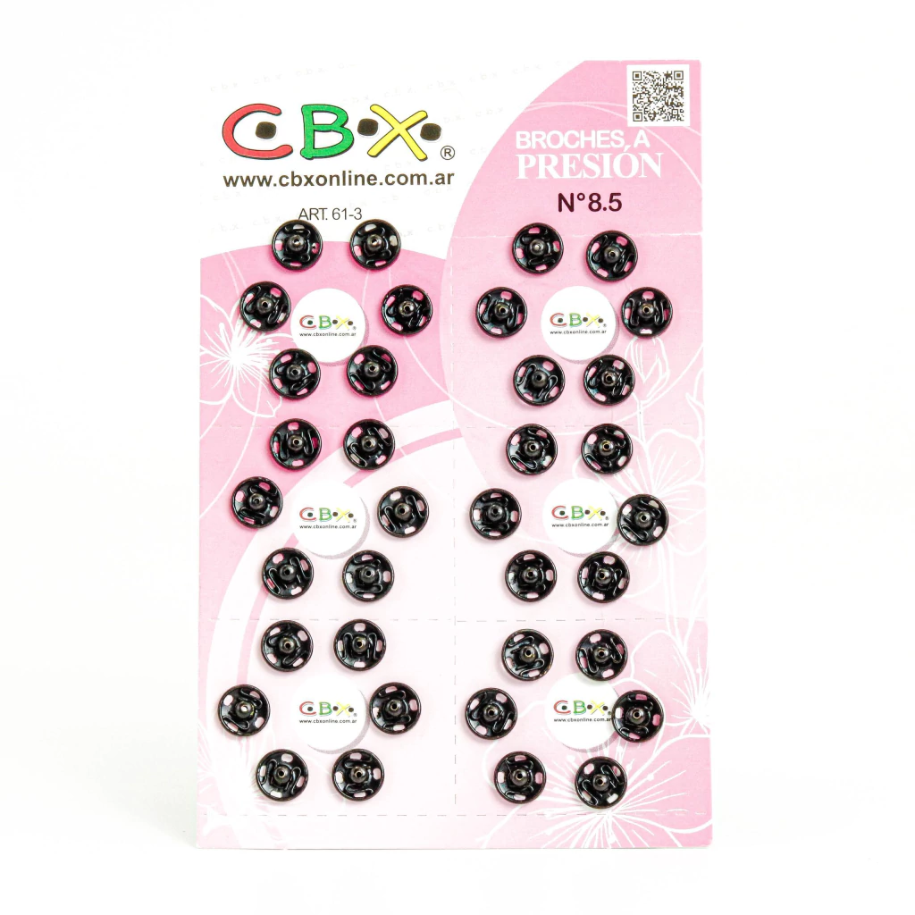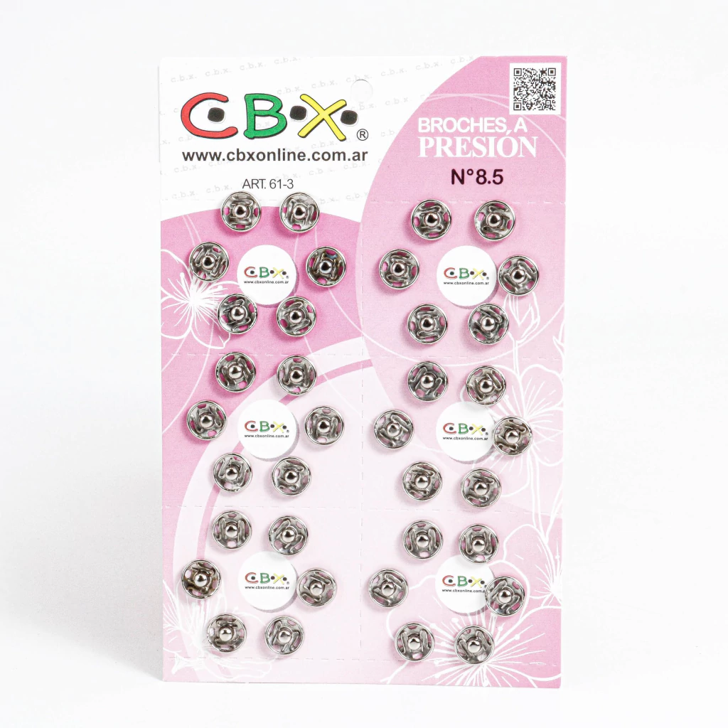 Broches a presión CBX de 8.5 mm fabricados en acero inoxidable, ideales para proyectos de costura, confección y manualidades. Ofrecen firme sujeción, resistencia al óxido y un acabado discreto para todo tipo de prendas o accesorios.