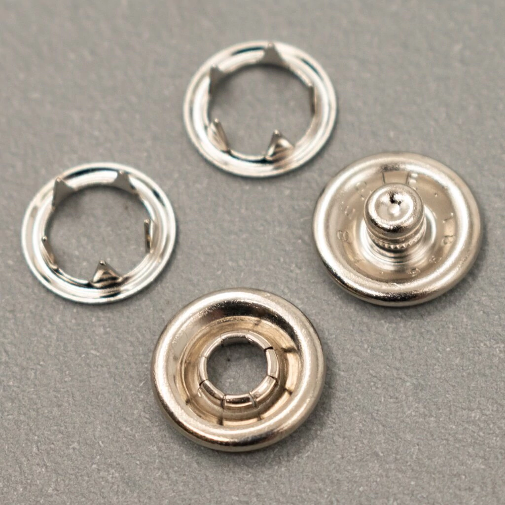 Broche doble aro de alta calidad marca Eberle, tamaño N11, con acabado en níquel resistente. Ideal para prendas y accesorios que requieren un cierre seguro y duradero. La colocación se realiza mediante matriz, garantizando un ajuste profesional y firme.