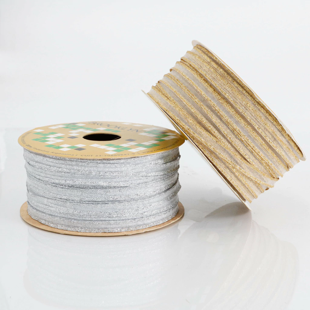 La cinta de organza con borde de lurex Brooklyn 1948 de 4 mm es perfecta para agregar detalles delicados y brillantes a tus proyectos de manualidades, decoración y envoltorios. Su textura translúcida y bordes metalizados aportan un toque de elegancia y sofisticación.