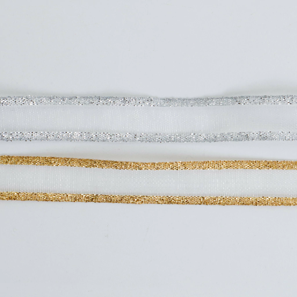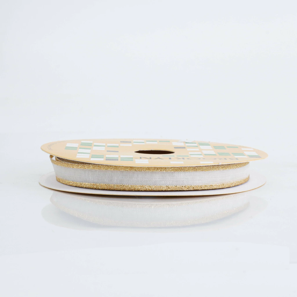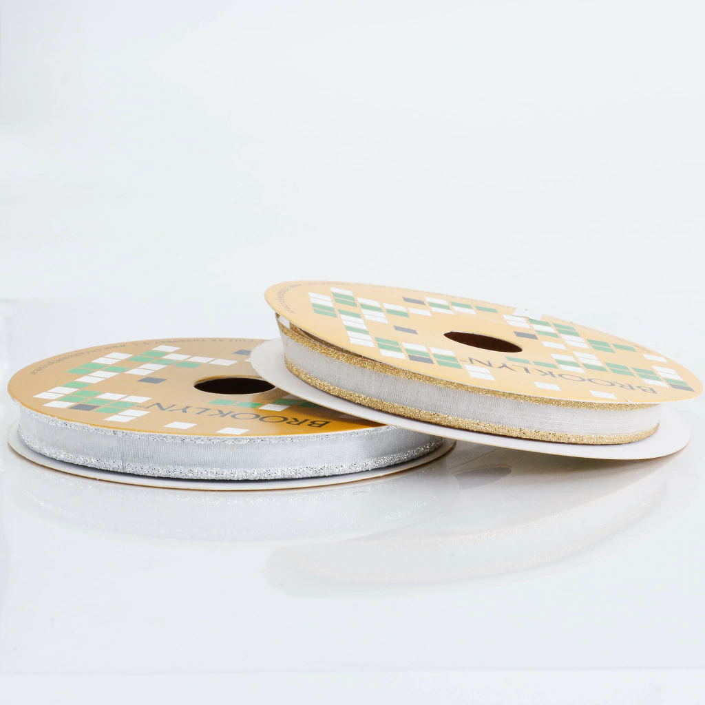 La cinta Brooklyn de organza con borde de lurex 1948 de 8 mm de ancho y 20 metros de largo combina la delicadeza de la organza con el brillo metálico del lurex en sus bordes. Ideal para detalles elegantes en confección, manualidades, decoración y empaques, aporta un toque sofisticado y luminoso a tus proyectos.