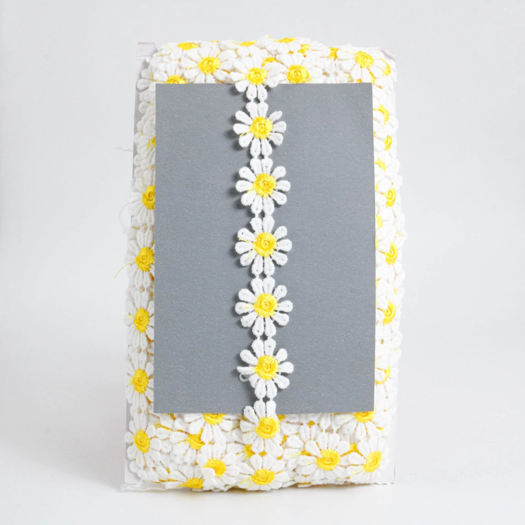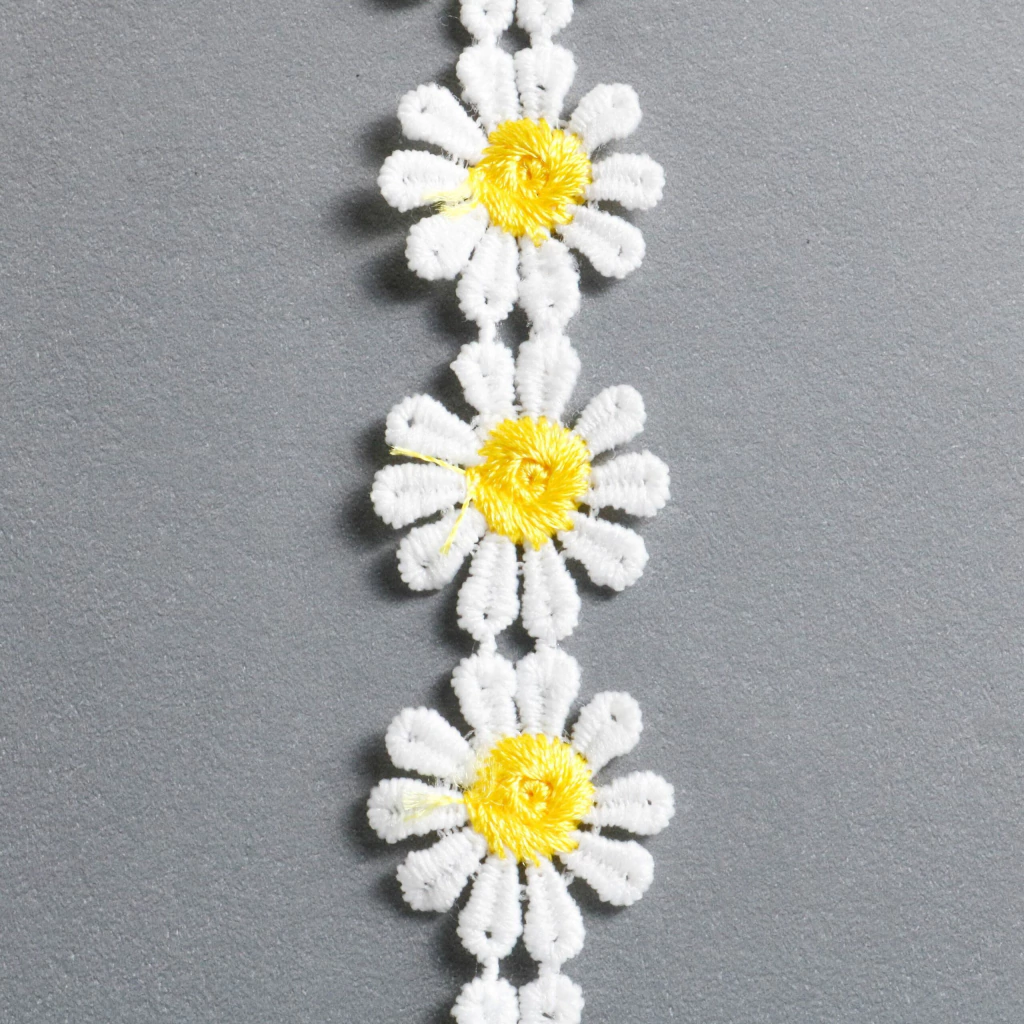 Broderie con diseño de florcitas amarillas, ideal para bordar y decorar prendas, accesorios y manualidades con un toque delicado y colorido. Su ancho de 25 mm permite aplicaciones versátiles en distintos proyectos textiles.