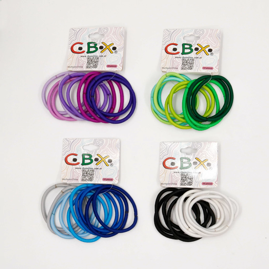 Las gomitas de pelo CBX de poliéster son una opción práctica y resistente para el uso diario. Este pack incluye 12 blísteres, cada uno con 10 gomitas, ideal para revendedores, tiendas de accesorios o salones de peinado.