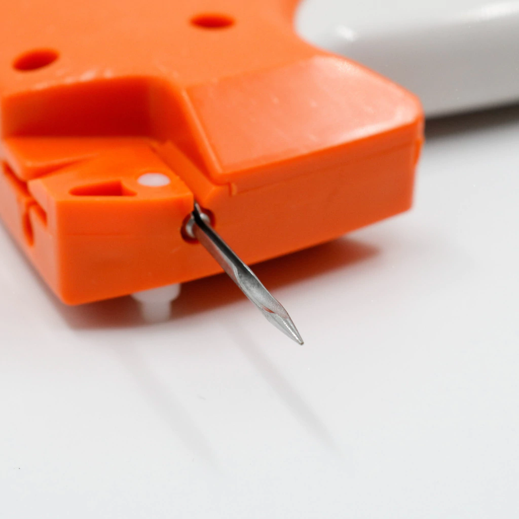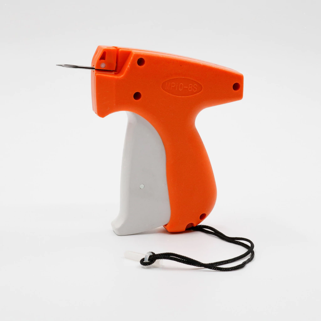 Herramienta práctica y eficiente para colocar tag pins finos de manera rápida y segura en prendas y productos. Ideal para uso en mercería, confección y ventas, facilita la fijación de etiquetas sin dañar los materiales.