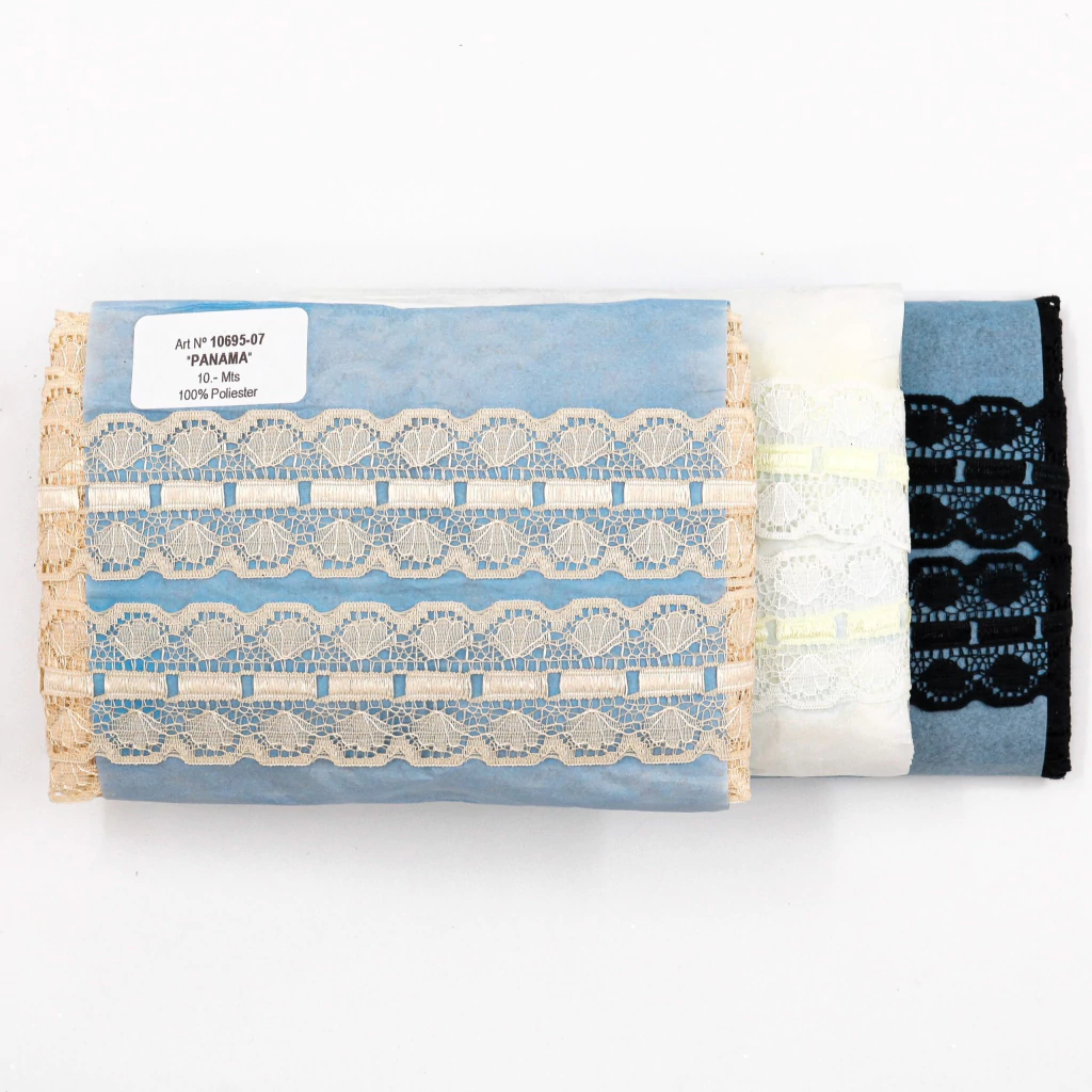 La puntilla de nylon NRV Panamá en colores surtidos, con un ancho de 35 mm y 10 metros de largo, es ideal para proyectos de confección, decoración y manualidades que requieren un acabado decorativo y resistente. Perfecta para dar un toque creativo y elegante a prendas, accesorios y detalles artesanales.