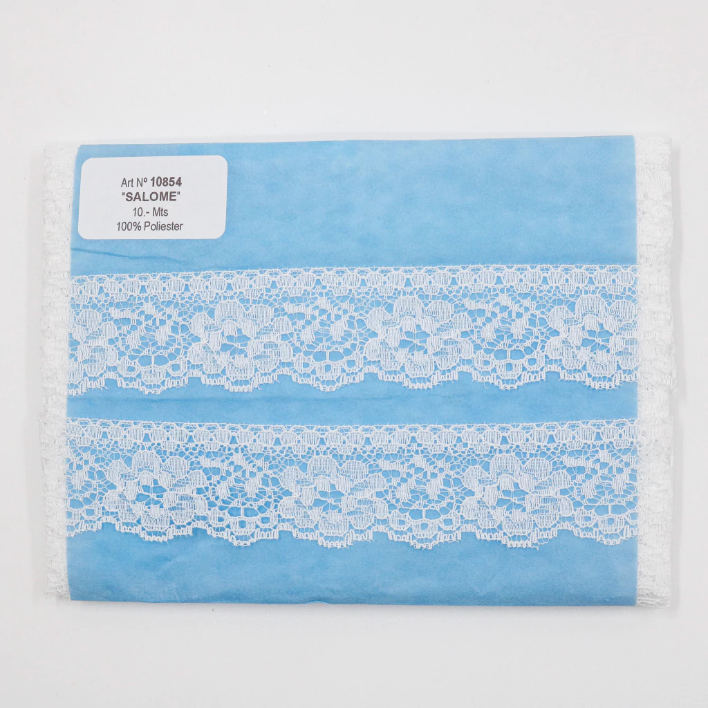 La puntilla de nylon NRV Salomé en color blanco, con un ancho de 30 mm, es perfecta para dar un acabado delicado y elegante a prendas, lencería, accesorios y proyectos de manualidades. Su diseño versátil permite crear detalles finos y decorativos en todo tipo de confecciones.