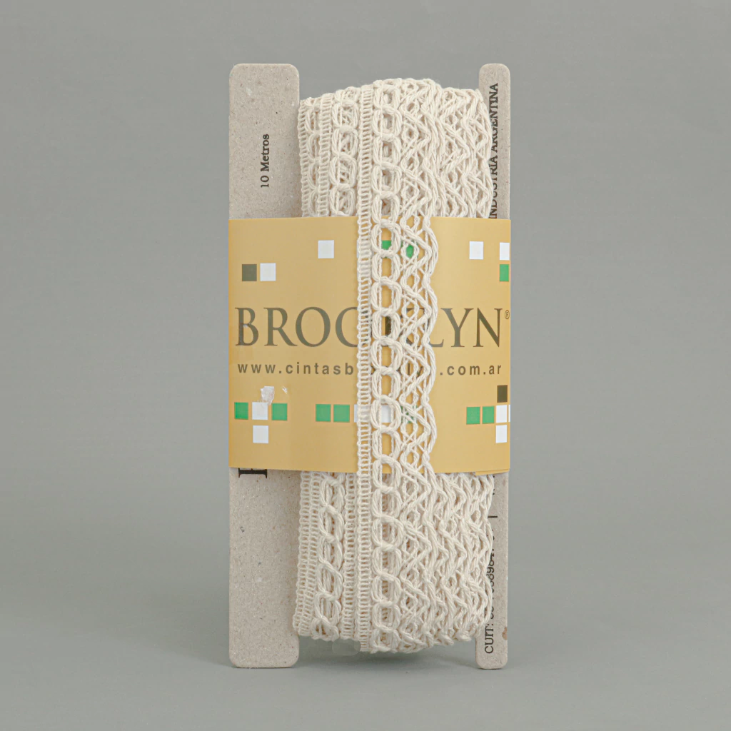 La puntilla Ojitos de algodón crudo Brooklyn en ancho de 25 mm es ideal para proyectos que requieren un detalle artesanal y destacado. Su diseño de pequeños ojitos brinda textura y un acabado rústico natural para prendas, manualidades y decoración.