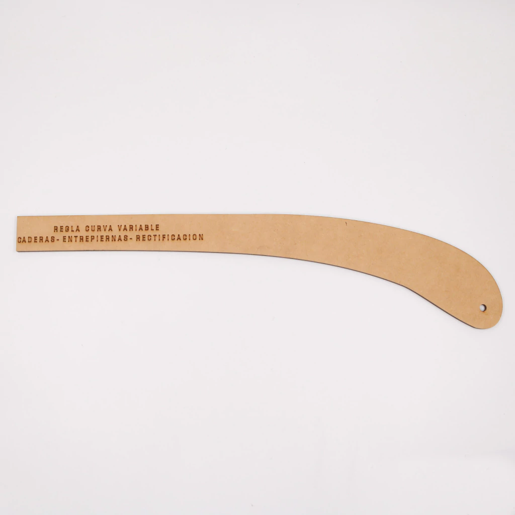La regla curva variable de fibrofácil es ideal para trazar curvas suaves y precisas en moldería, como escotes, sisas, tiros y caderas. Su diseño permite adaptarse a distintas formas, siendo una herramienta versátil para costura, diseño y confección.